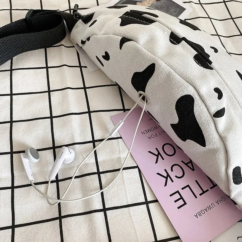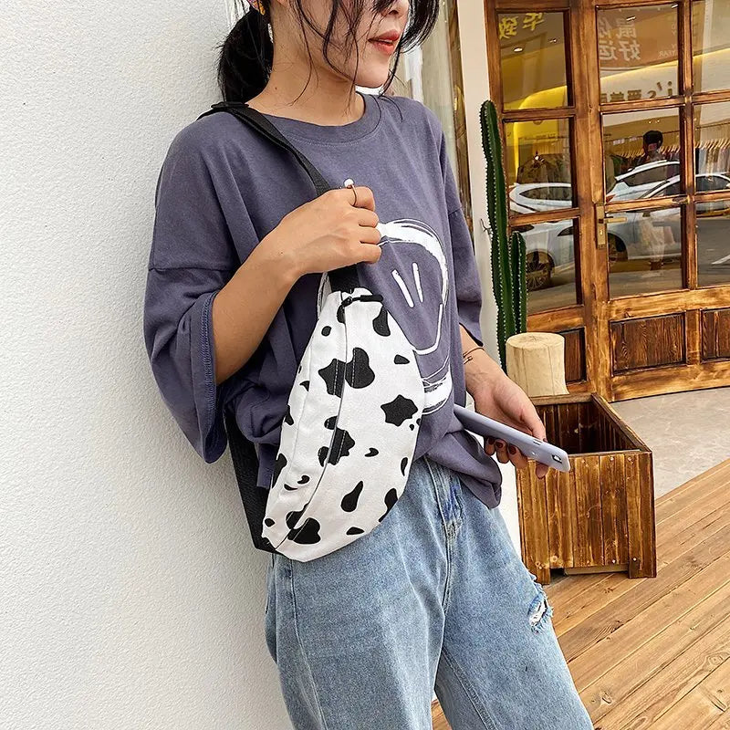 Cow Print Canvas Belt Bag for Women Fanny Pack Female Banana Waist Bag
