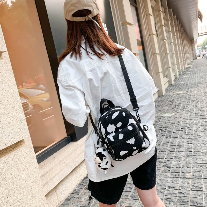 This stylish daypack is perfect for women, ladies, and girls for outdoor travel and shopping. It features a cute cow print design and comes with a plush pendant.