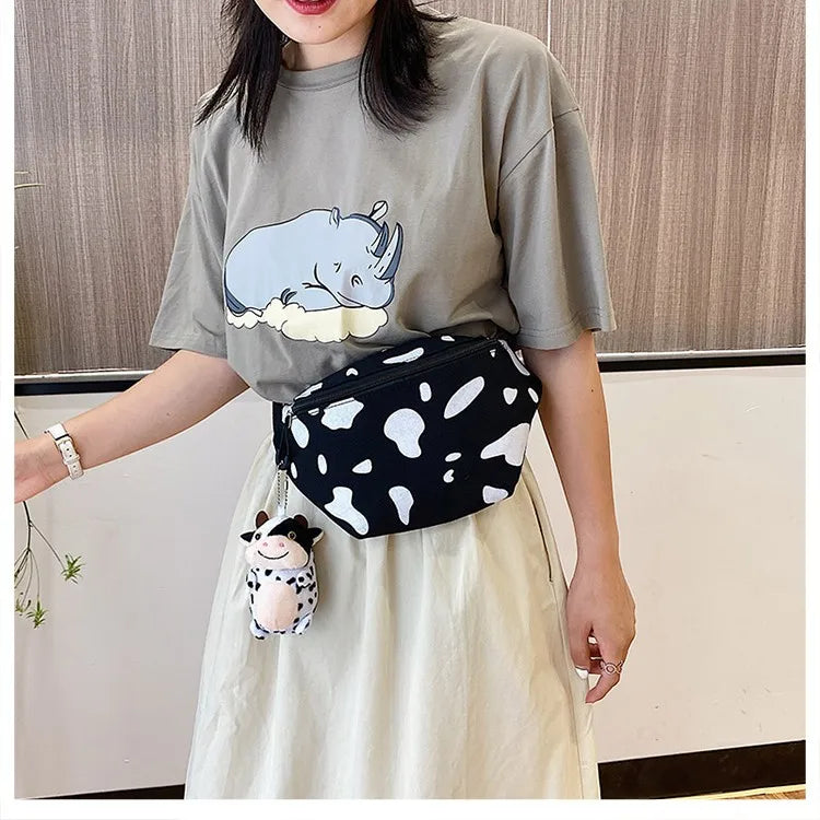 This women fanny pack with a trendy cow print design is perfect for travel and sports. It features an adjustable strap for a comfortable fit.