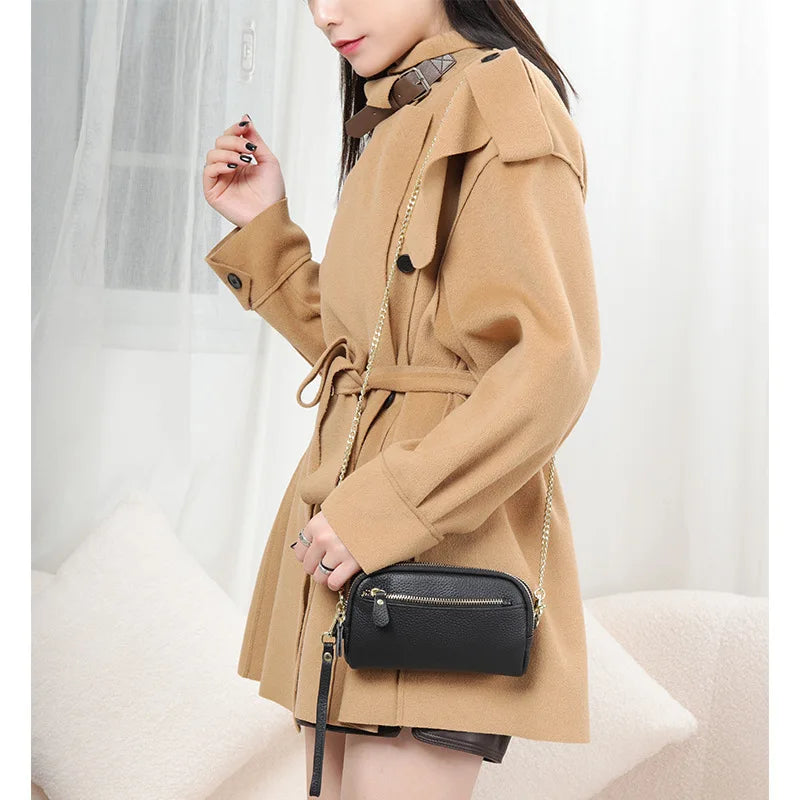 Elegant and versatile chain strap shoulder bag made of high-quality cowhide. Perfect for everyday use with a large capacity, zipper closure, and long wallet design.