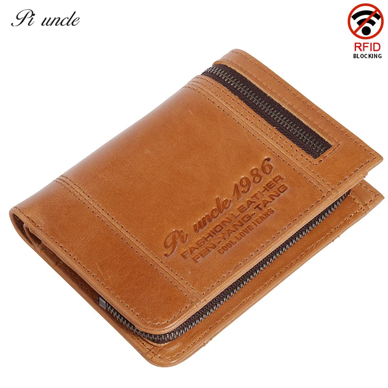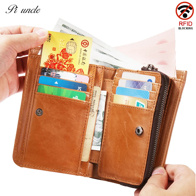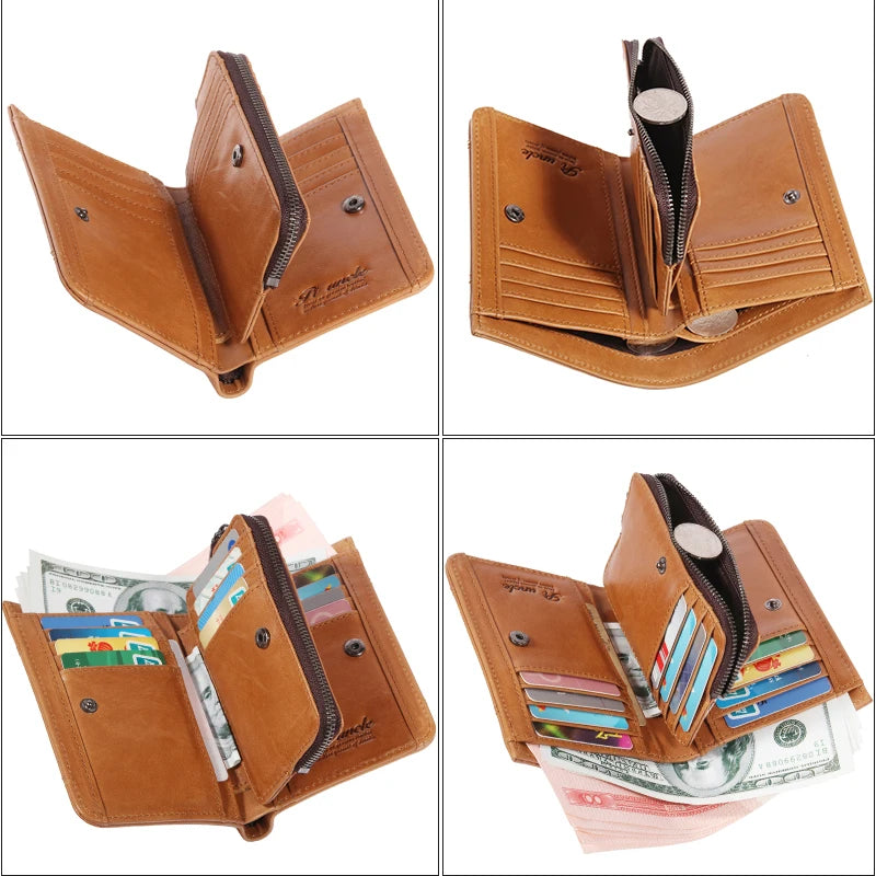 Cowhide Leather Men Short Wallets Trifold Wallet Zipper Coins Pocket