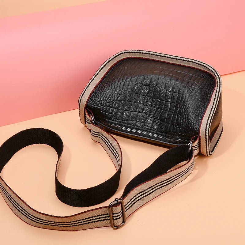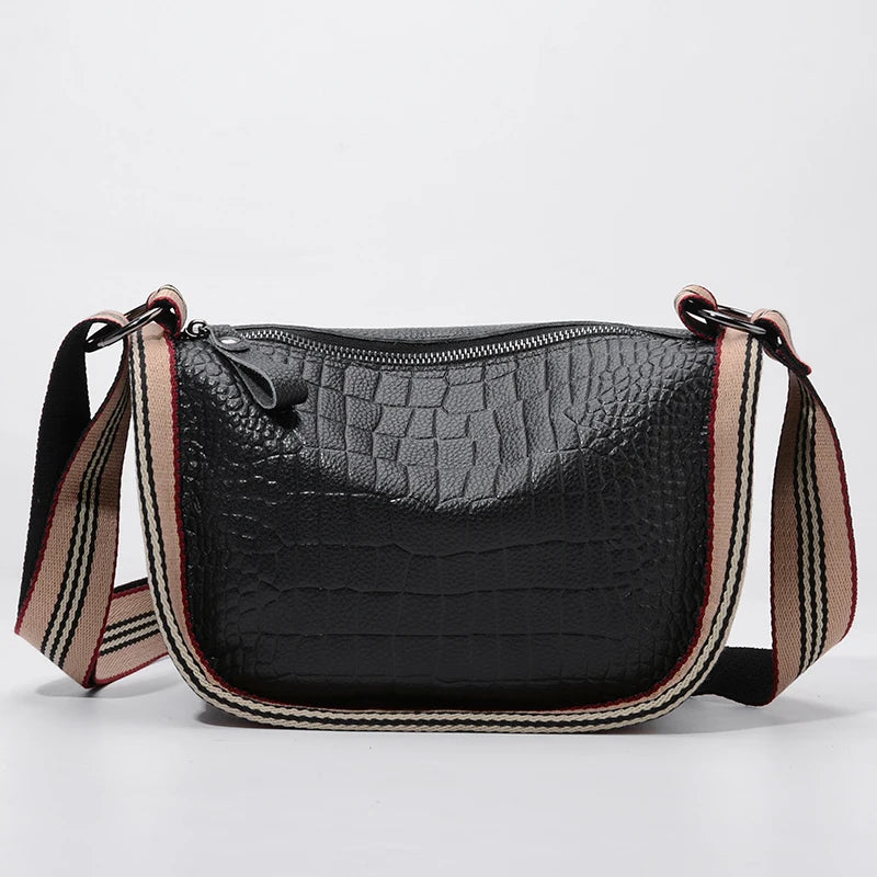 This stylish women's shoulder bag is crafted from cowhide leather with a crocodile pattern design. It features a zipper closure and adjustable shoulder strap for convenience.