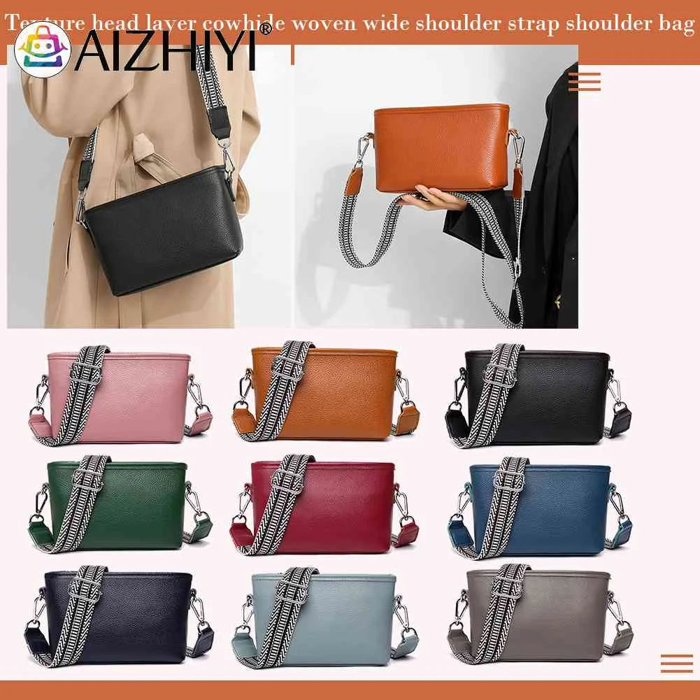 This women's messenger bag is made from first layer cowhide leather, featuring a wide fabric strap. It's perfect for a casual weekend getaway or vacation.