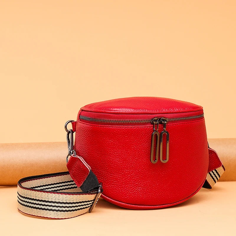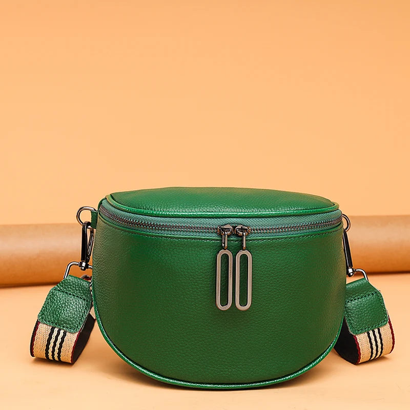 This small crossbody bag is made of soft cowhide leather and features a stylish semicircle design. It is perfect for everyday use and can easily fit essentials such as phone, wallet, and keys.