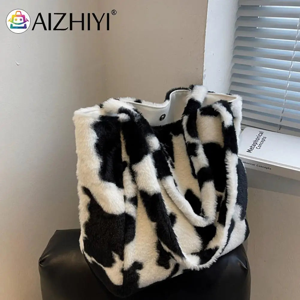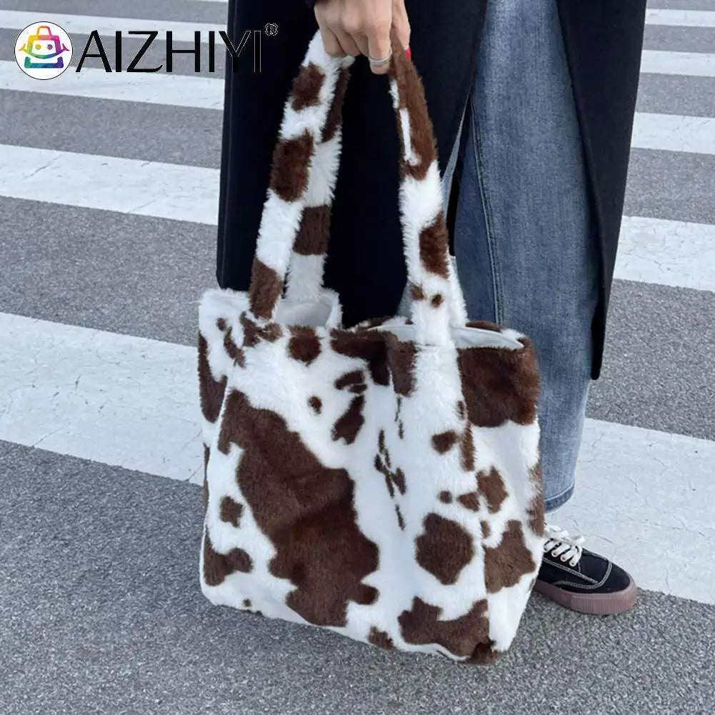 Stay trendy with this retro shoulder bag featuring a creative cow milk printing pattern. Made of plush material, perfect for autumn and winter seasons.