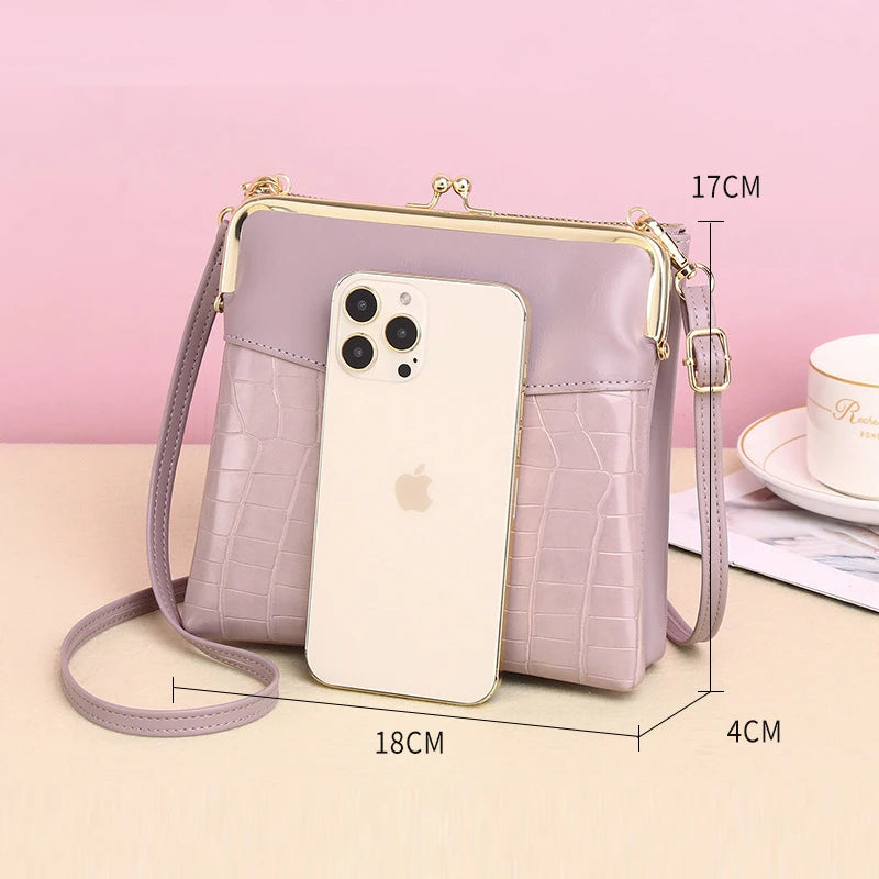 Chic and stylish crossbody bag made of high-quality crocodile grain PU leather. Features a kiss-lock closure and a compact size perfect for carrying your essentials.