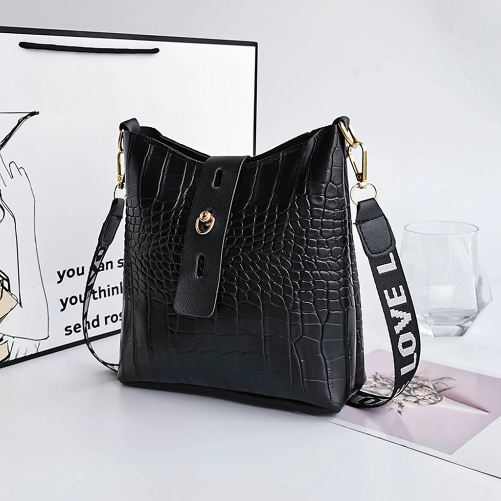 This stylish messenger bag is made of high-quality PU leather, featuring a crocodile pattern design. It has a crossbody strap and a buckle closure.