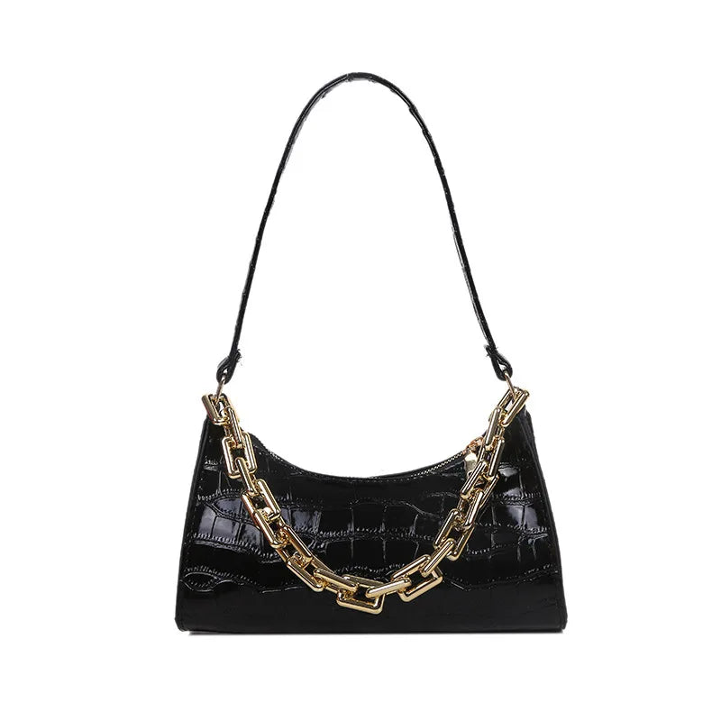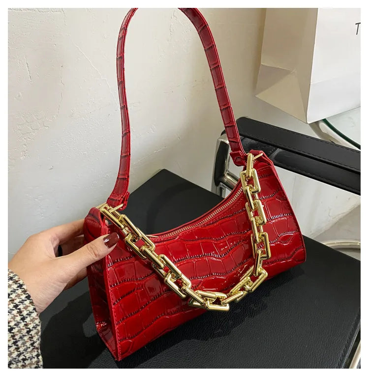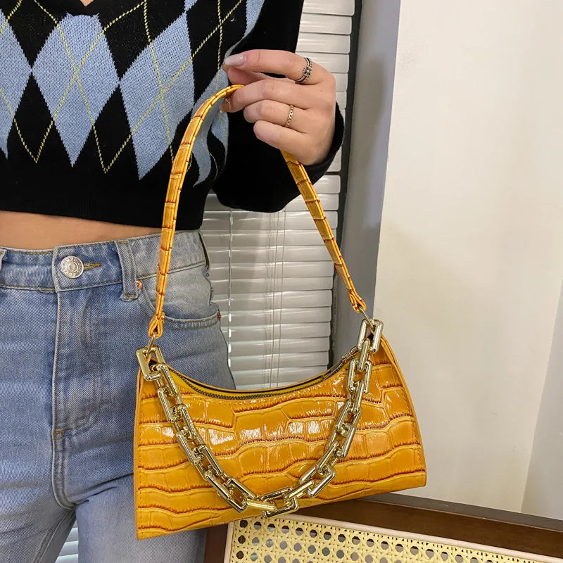 Stay stylish with this retro crocodile pattern armpit bag, perfect for outdoor travel. It features a chain strap and ample space for your essentials.