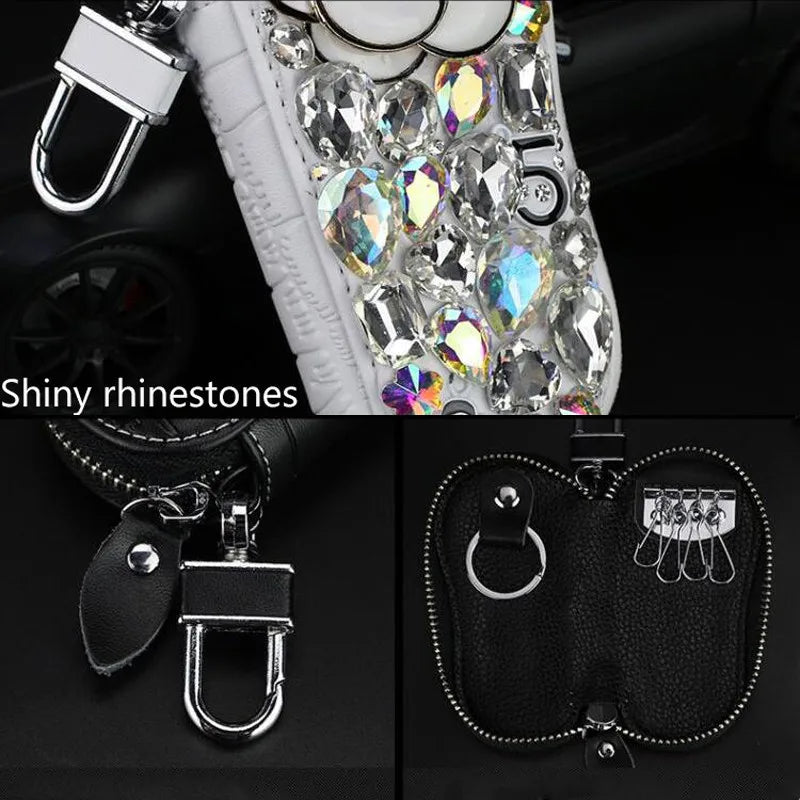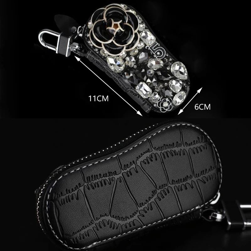 This women's car key holder features a retro crocodile pattern with added diamonds, making it a luxurious accessory. The camellia key pouch design adds a touch of elegance.