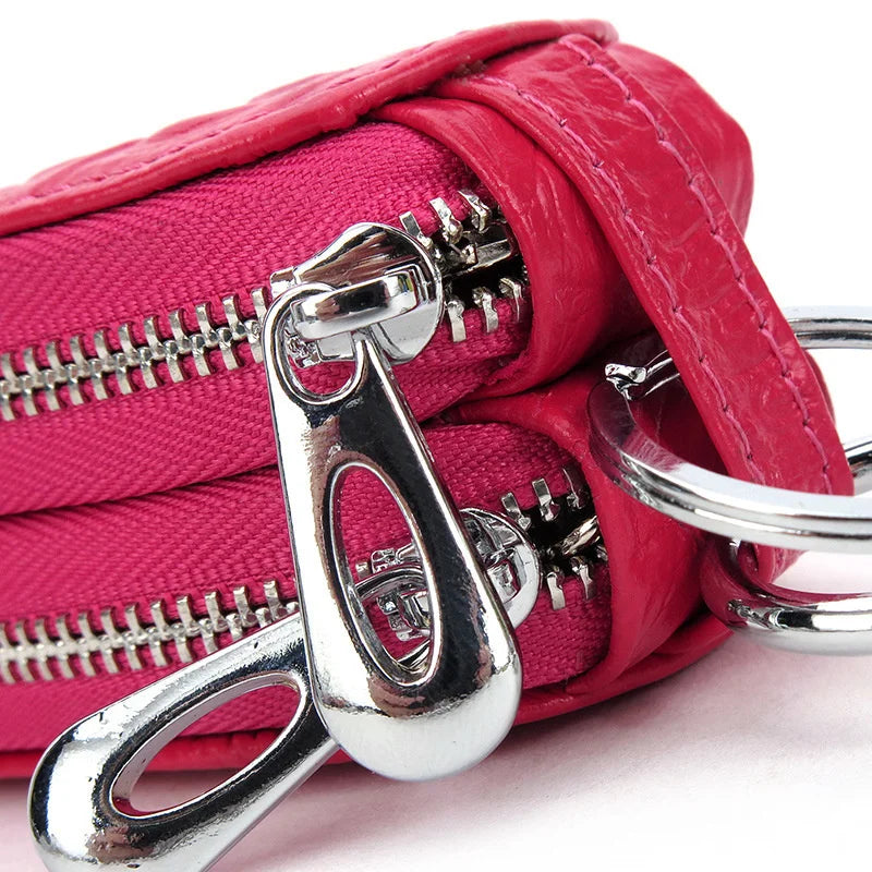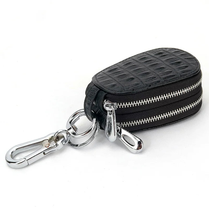 This stylish key wallet is made of cow leather with a crocodile pattern design. It features a double layer design with a zipper closure, perfect for organizing your keys and other small essentials.