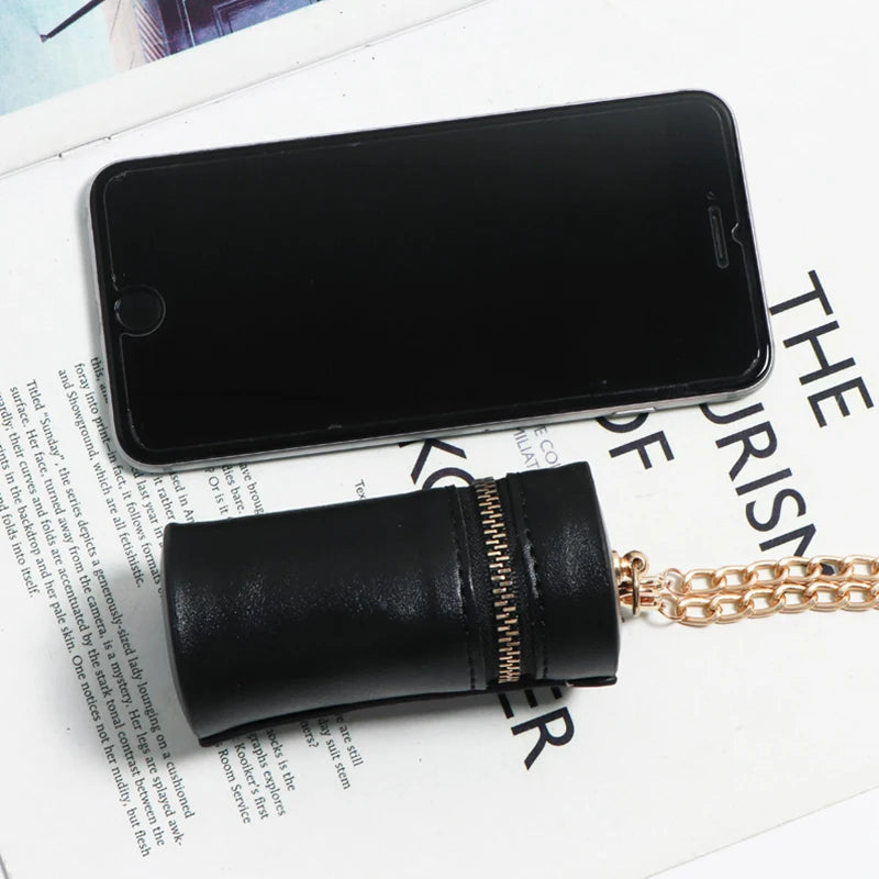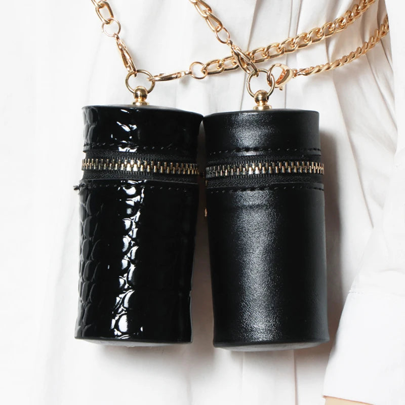 This mini shoulder bag is perfect for carrying your essentials in style. Featuring a crocodile pattern, chain strap, drum-shaped design, and a lipstick coin purse, it combines fashion and functionality.