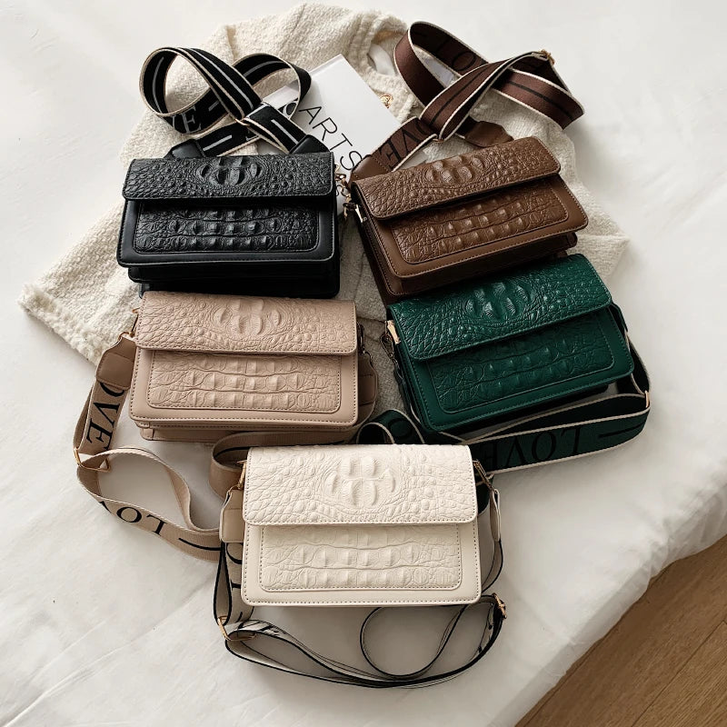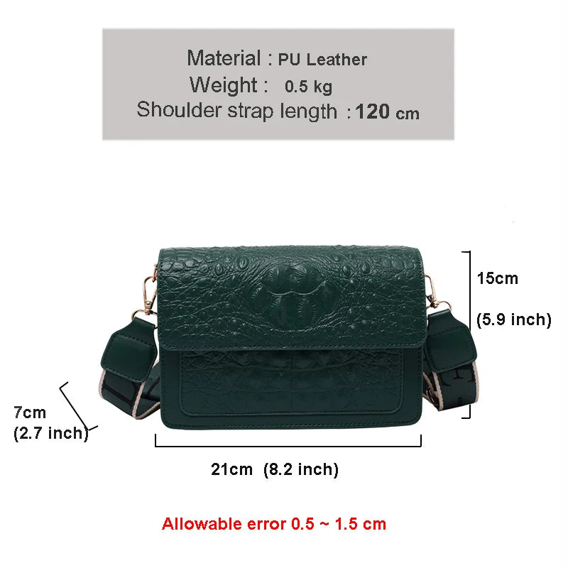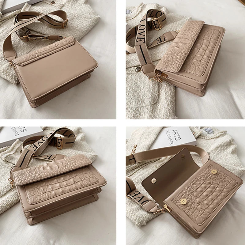 Crocodile Pattern PU Leather Shoulder Bag with Wide Strap