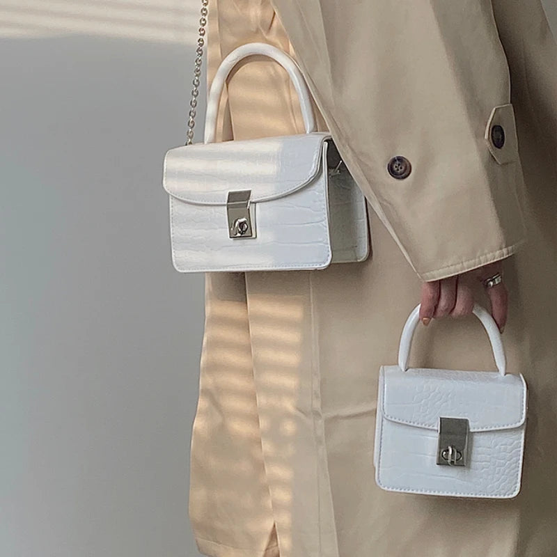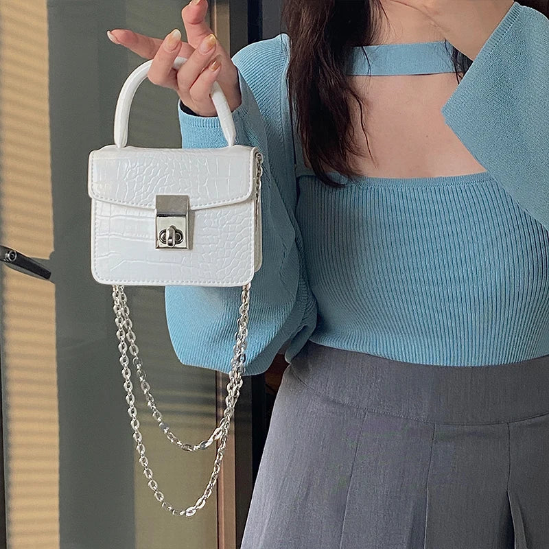 This small square shoulder bag features a crocodile pattern design, perfect for a retro and chic look. The bag includes a chain crossbody strap and flap closure, ideal for everyday use.