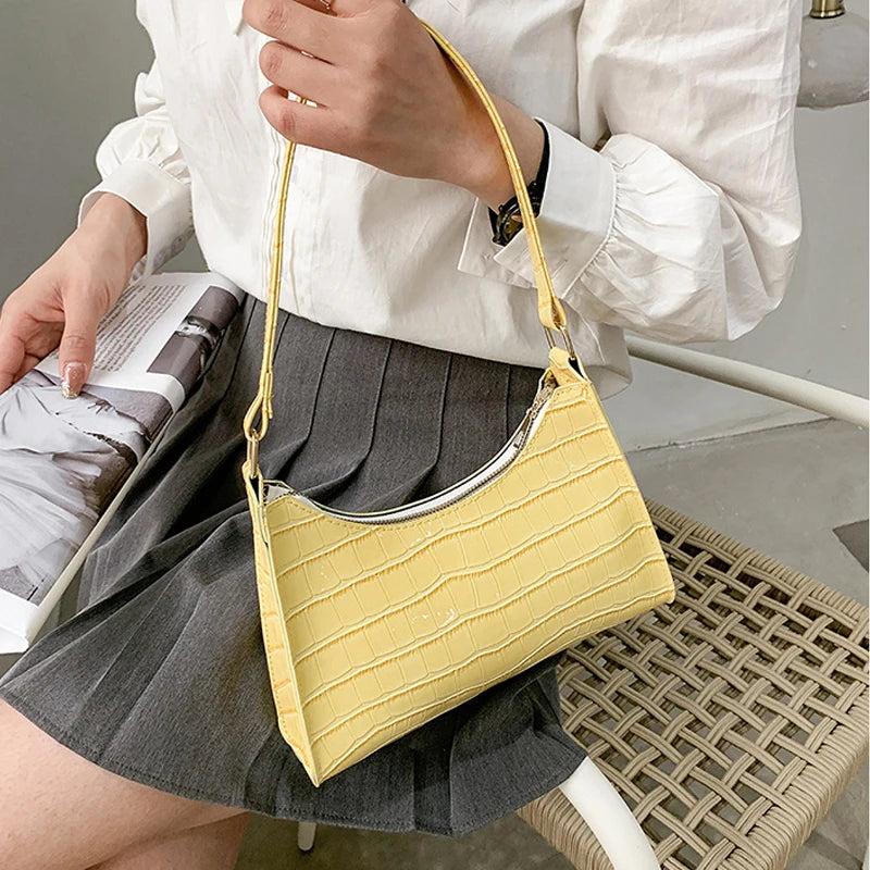This PU leather shoulder bag features a crocodile pattern design in bright colors. It is perfect for everyday use and adds a touch of style to any outfit.
