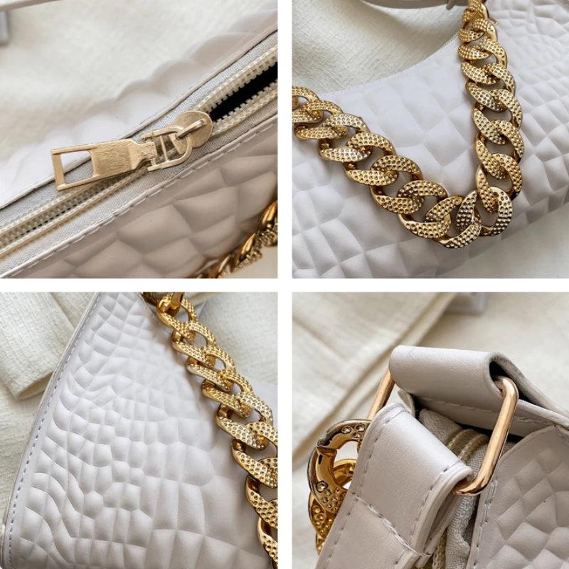 Elevate your style with this high-end crocodile pattern shoulder bag. Crafted with solid chain details, this bag is perfect for any fashionable woman.