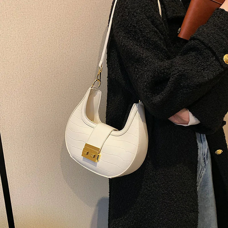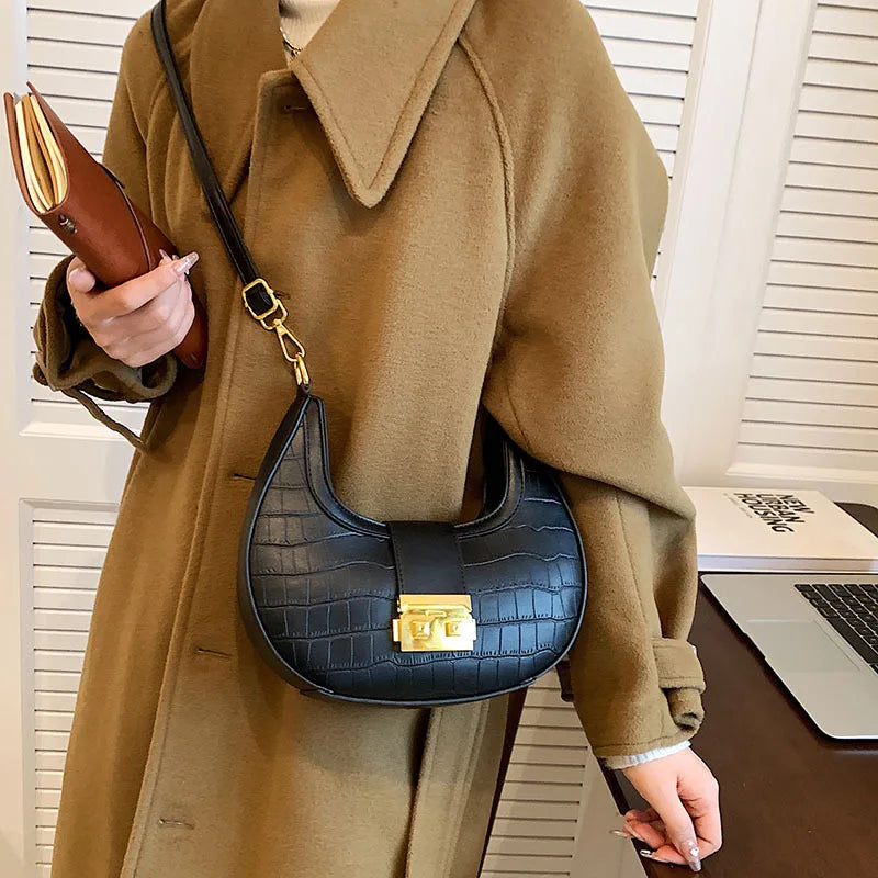 Crocodile Pattern Women's Shoulder Bag Lock Crossbody Bag Half Moon
