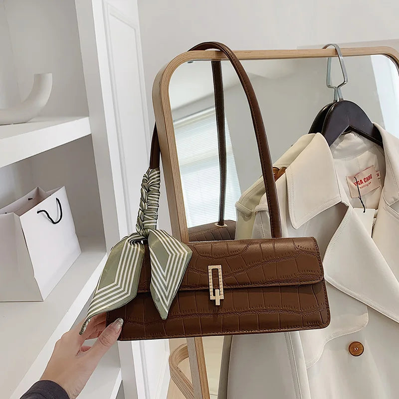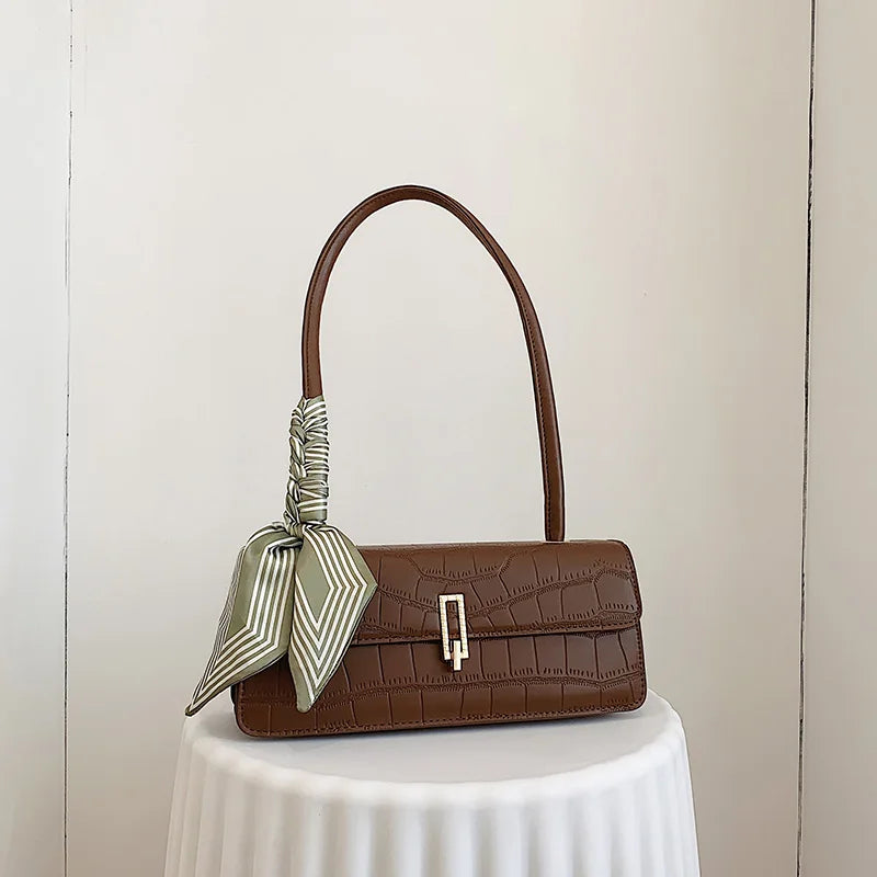 This women's bag is crafted from crocodile-patterned PU leather, designed in a rectangular shape for a leisurely style.