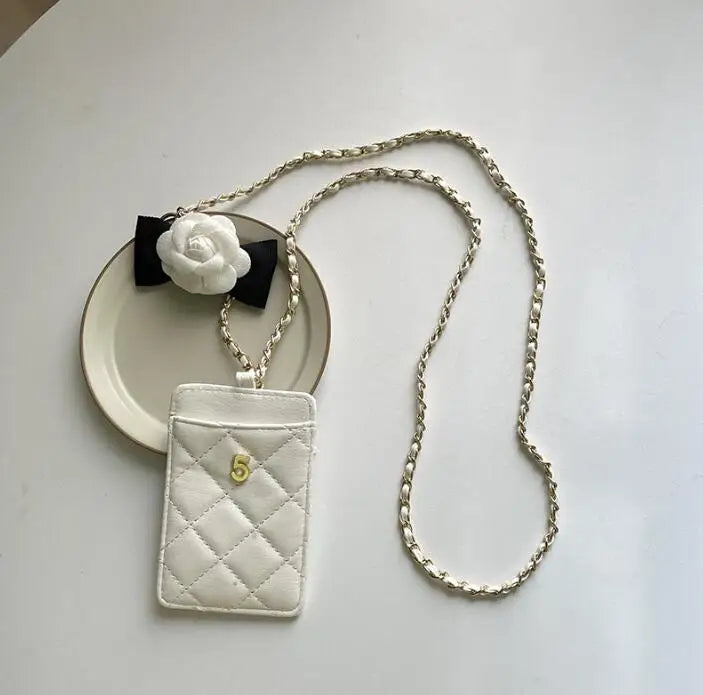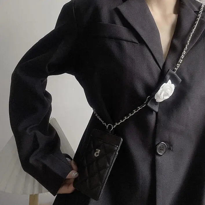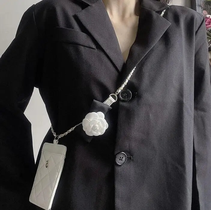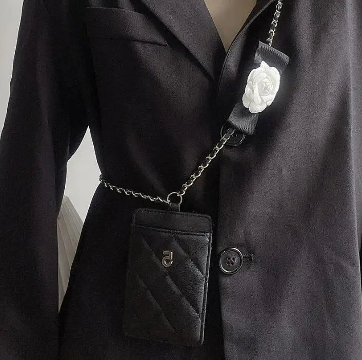 This stylish crossbody phone bag is designed for women on the go. Made of high-quality leather with a braided chain strap and flower waist chain decoration, it is both functional and fashionable.
