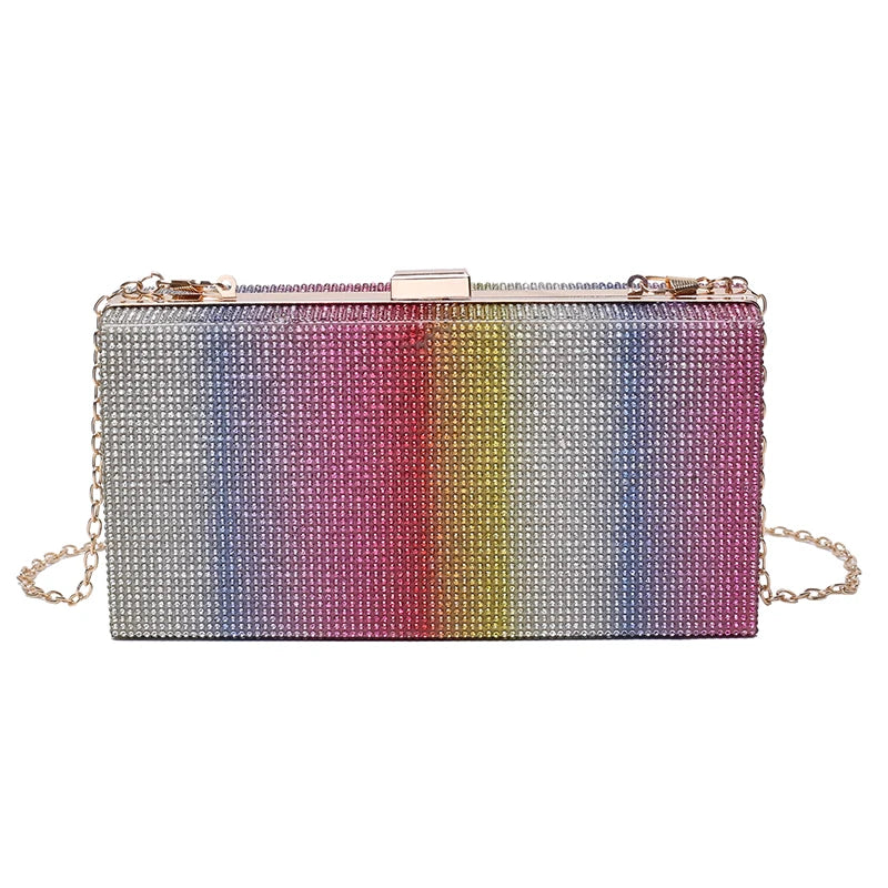 Elegant and stylish crystal diamond square box handbag with thin metal chain for a high fashion look. Perfect clutch for women.