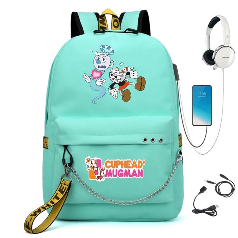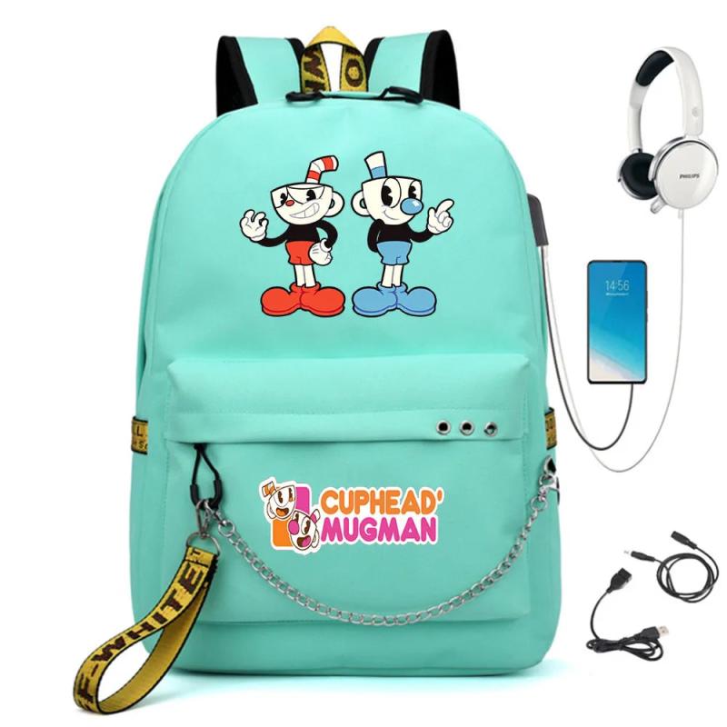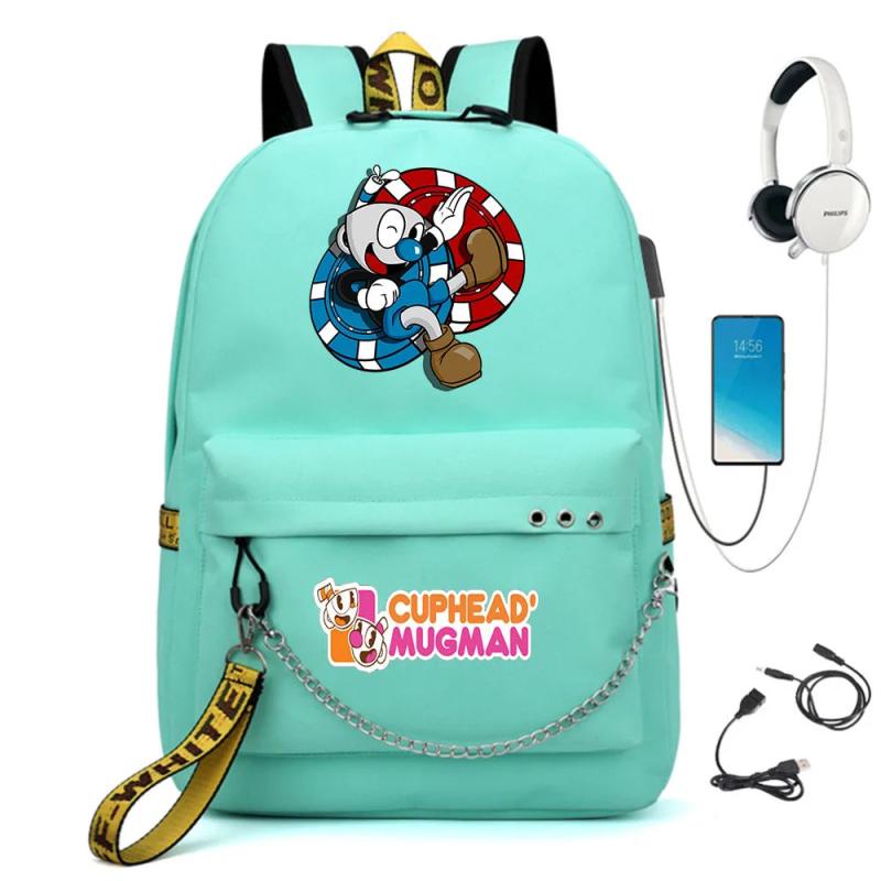 This nylon backpack features a unique Cuphead cartoon design, suitable for students and teenagers. It includes a USB charging port and is perfect for carrying laptops and books.