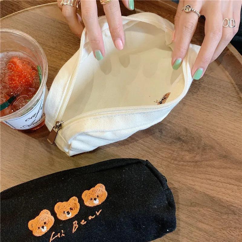 This adorable canvas cosmetic bag features a lovely brown bear embroidery design, making it perfect for students or anyone looking for a portable clutch purse.