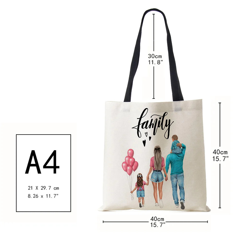 This adorable tote bag features a cartoon mama and baby print, perfect for moms on the go. Made of durable linen material, it's lightweight and easy to carry.
