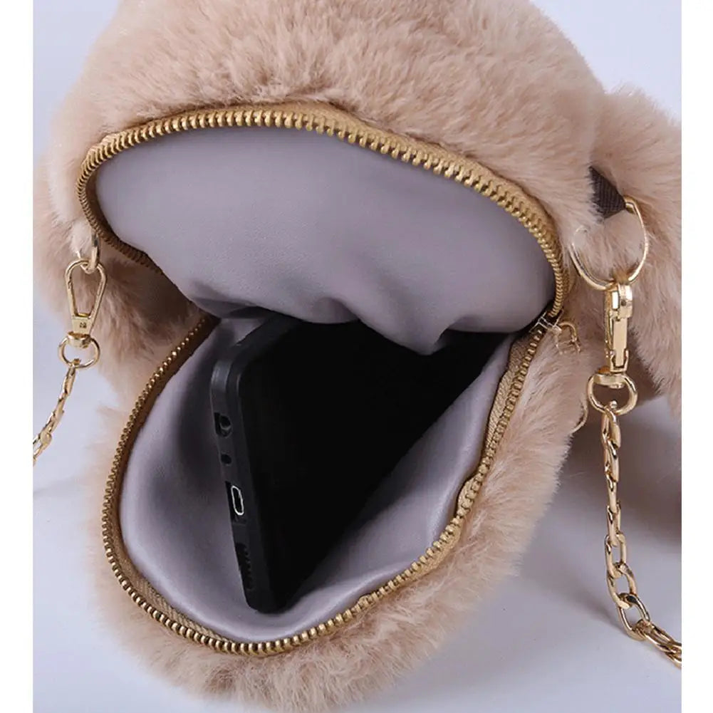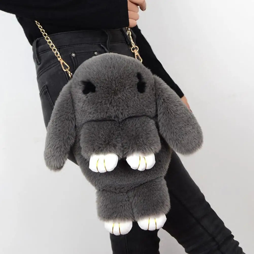 This adorable chain bag features fluffy rabbit fur pompoms and a cartoon rabbit design, making it a perfect accessory for women.
