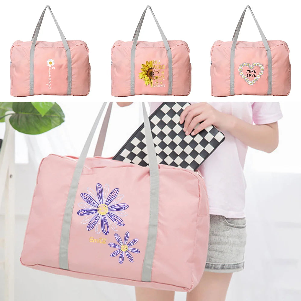 Stay organized while traveling with this foldable duffle bag featuring a charming daisy print. Perfect for storing your clothes and accessories on holiday trips.