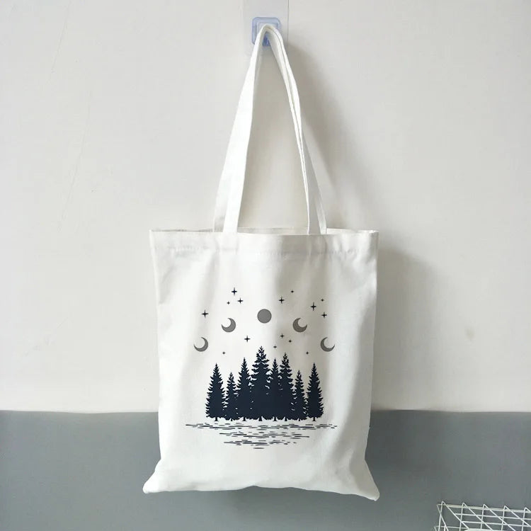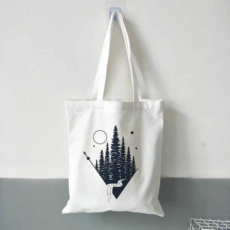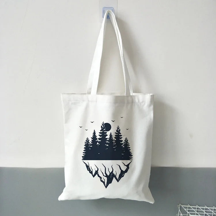 This stylish canvas tote bag features a dark forest print, making it perfect for shopping, travel, or everyday use. Made of high-quality cloth material, this shoulder bag is eco-friendly and reusable.