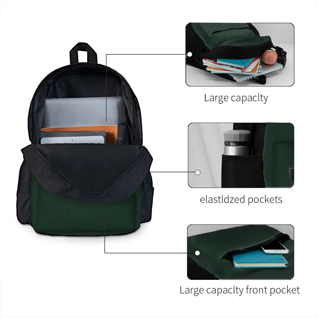 This solid dark green backpack is designed for both men and women. It is a versatile bag suitable for school, work, or casual outings.