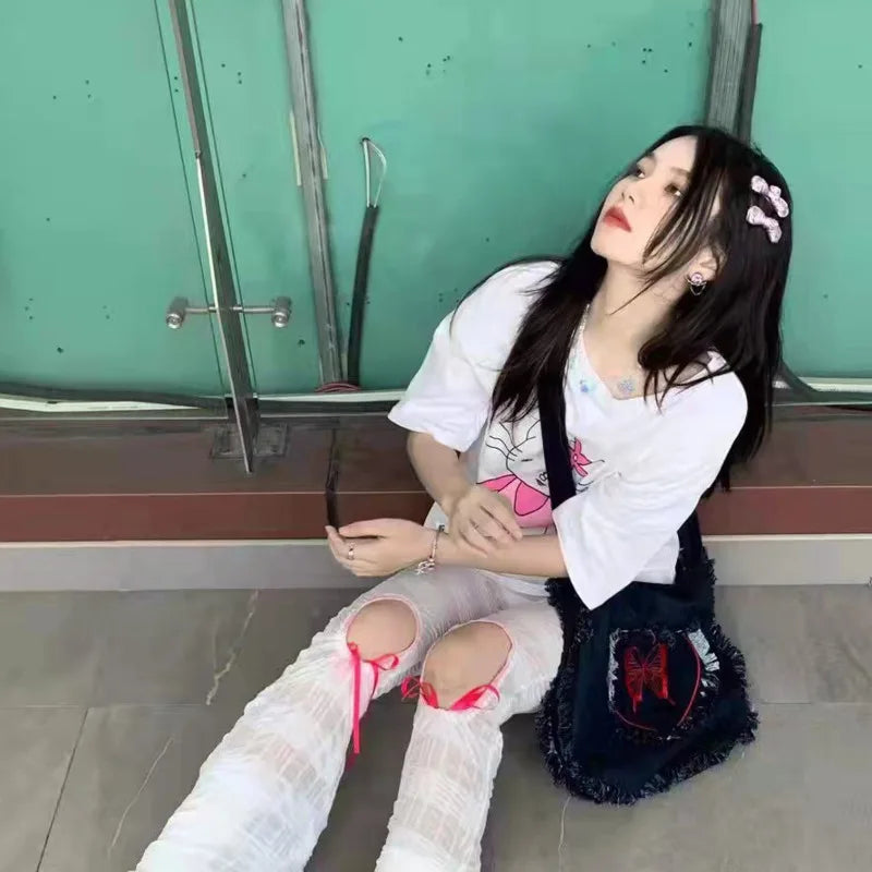 Denim Crossbody Shoulder Bag Women Frayed Heart Butterfly Embroidered