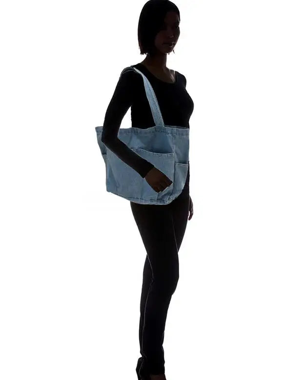 This denim shoulder bag is perfect for both men and women. It's spacious and stylish, making it great for shopping or everyday use.