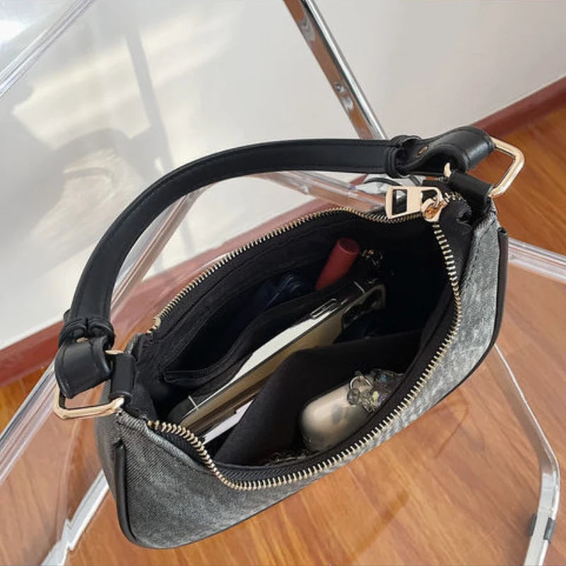This denim shoulder bag is a versatile accessory that can be paired with various streetwear outfits. Its half moon shape adds a unique touch to your look.