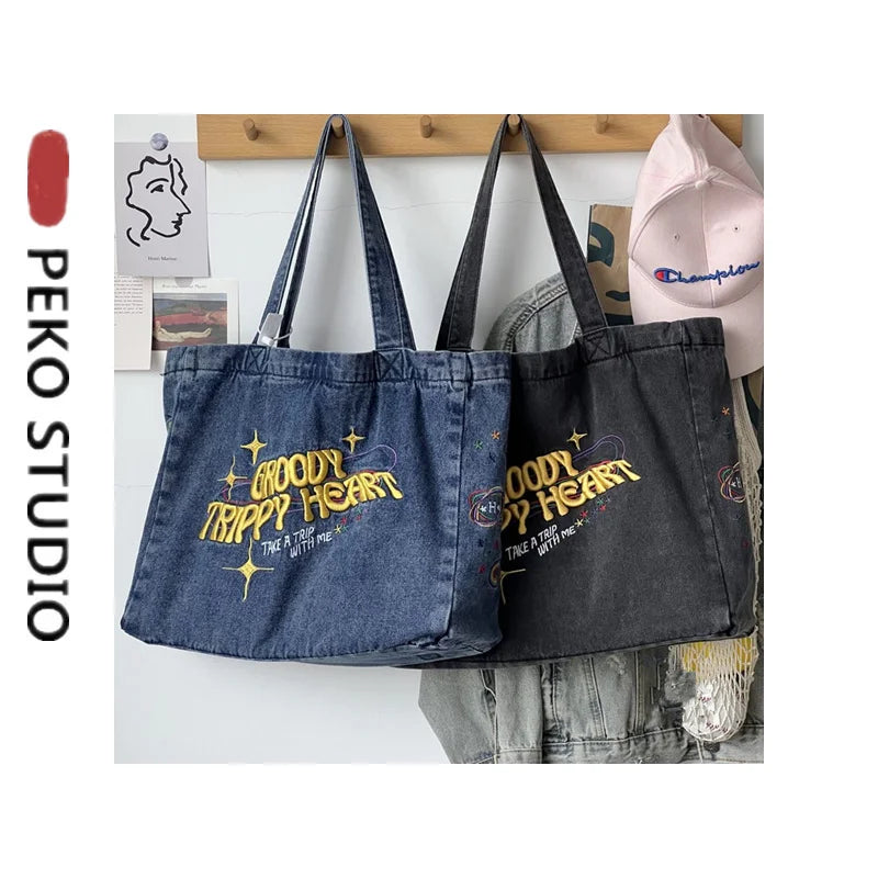 This denim tote bag is perfect for students and messengers. It offers ample storage space for books and essentials.