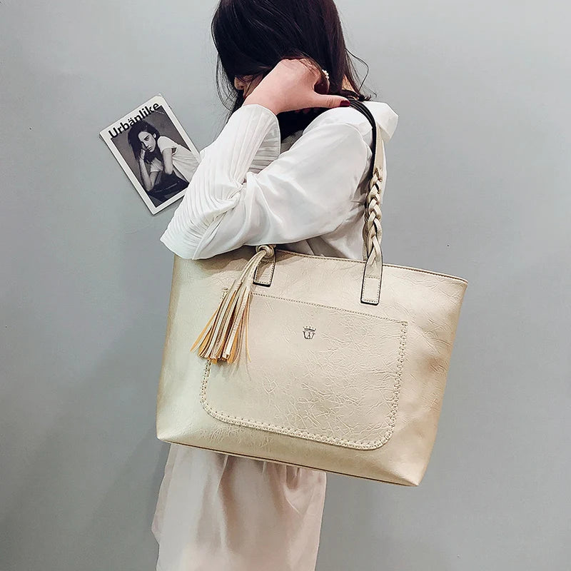 Designer Leather Shoulder Tote Bag with Tassel