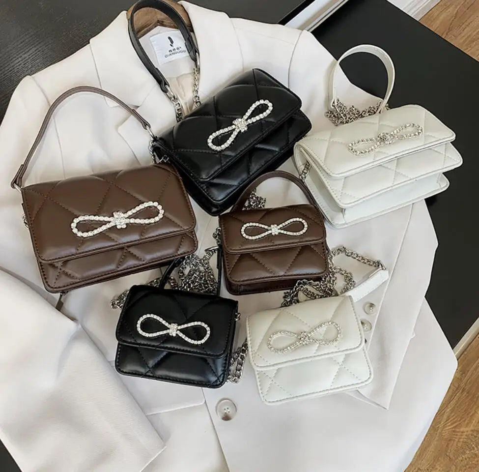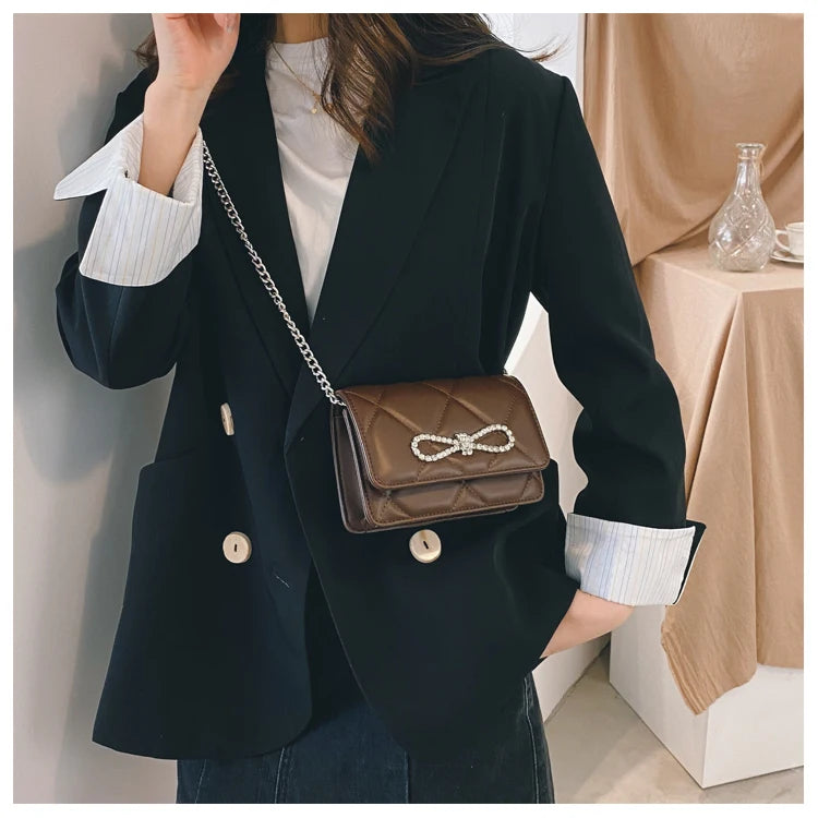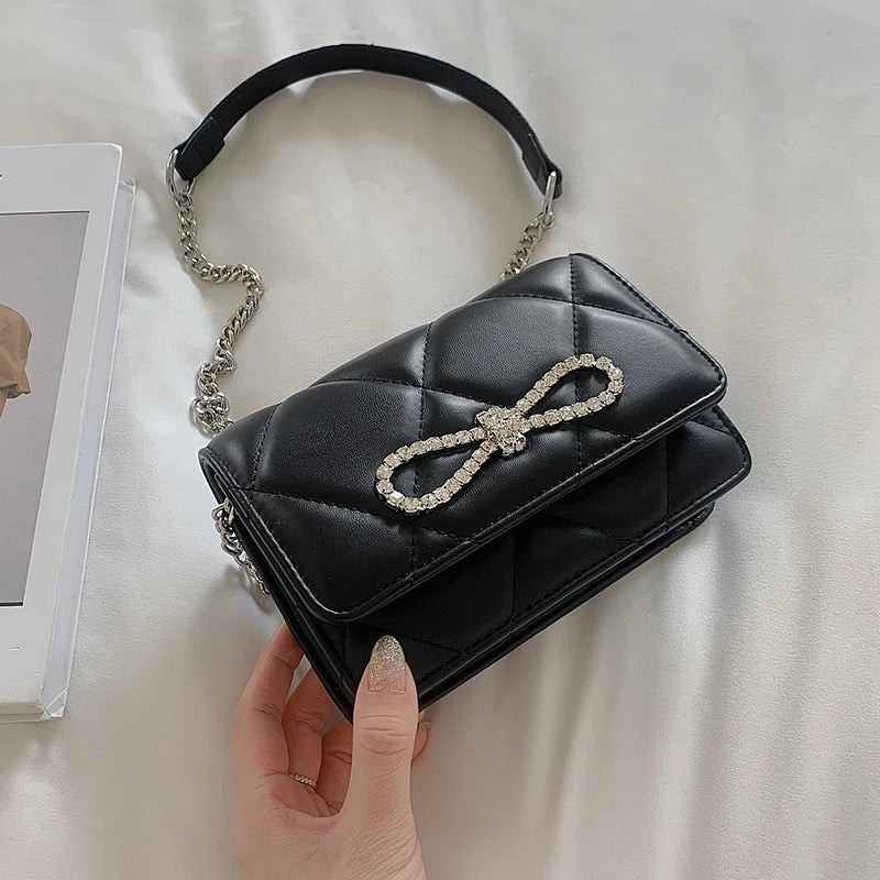 This stylish crossbody bag features a diamond bow design and is made of high-quality PU leather. It has a chain shoulder strap for added convenience.