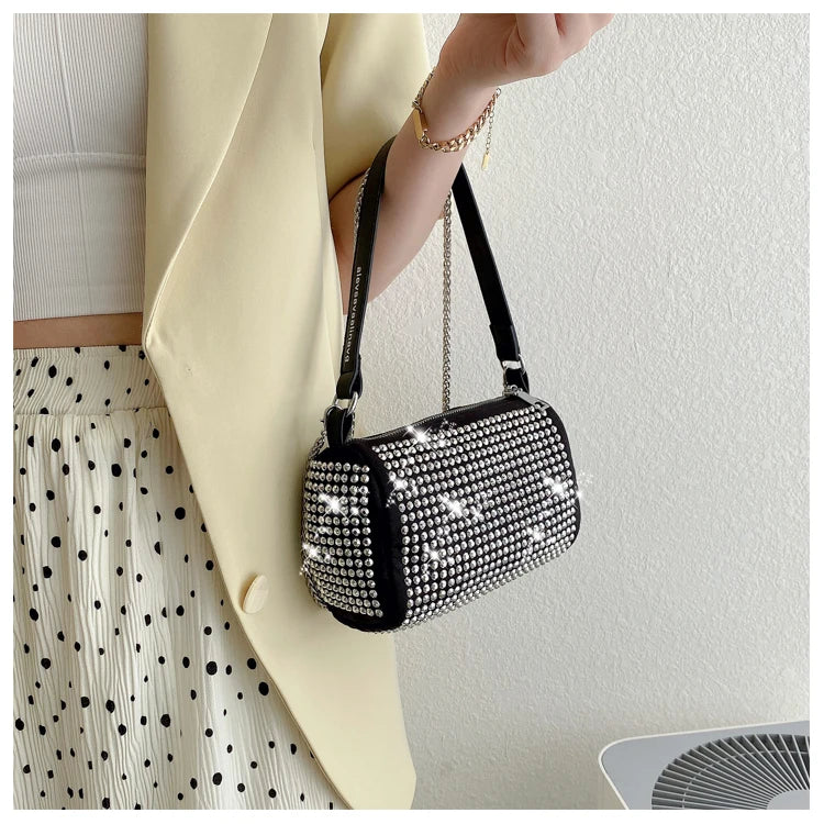 Elegant and stylish shoulder bag with diamond chain design. Perfect for carrying essentials.