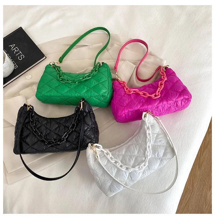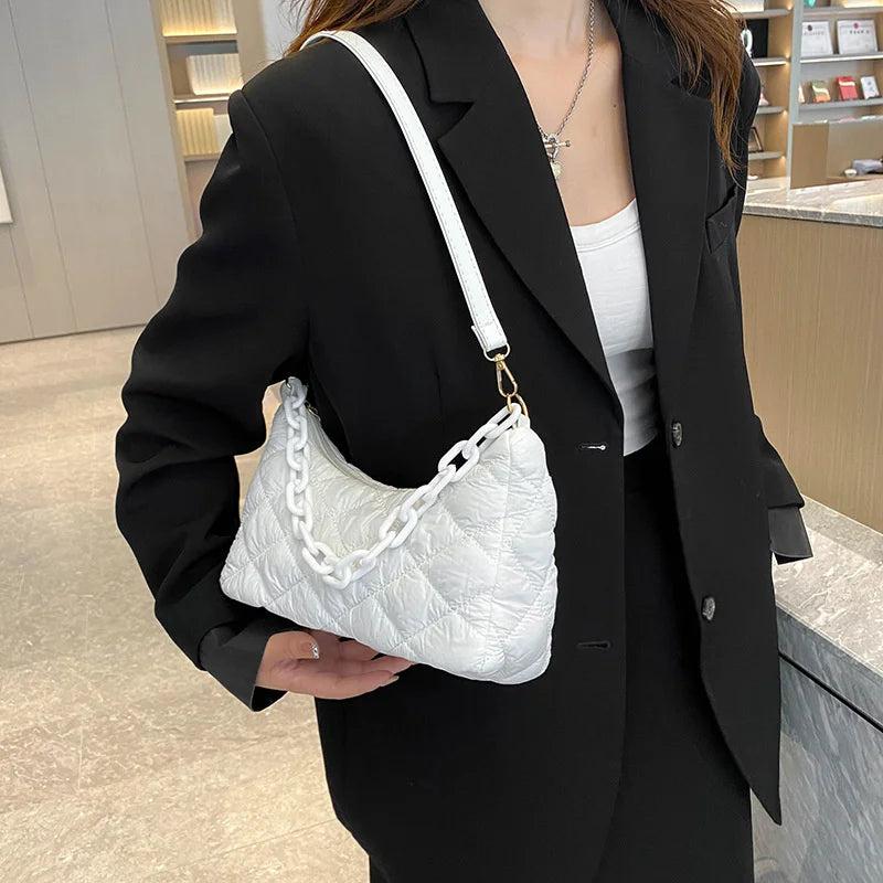 Elegant cotton handbag with diamond lattice design for women. Features a chain strap for versatile wear. Perfect for any occasion.