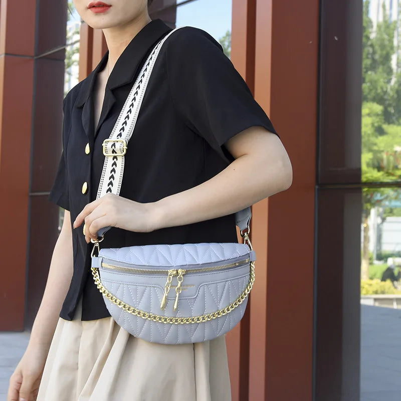 This stylish waist bag features a diamond lattice pattern with a chain zipper design. It can be worn as a fanny pack or crossbody chest bag for a trendy look.