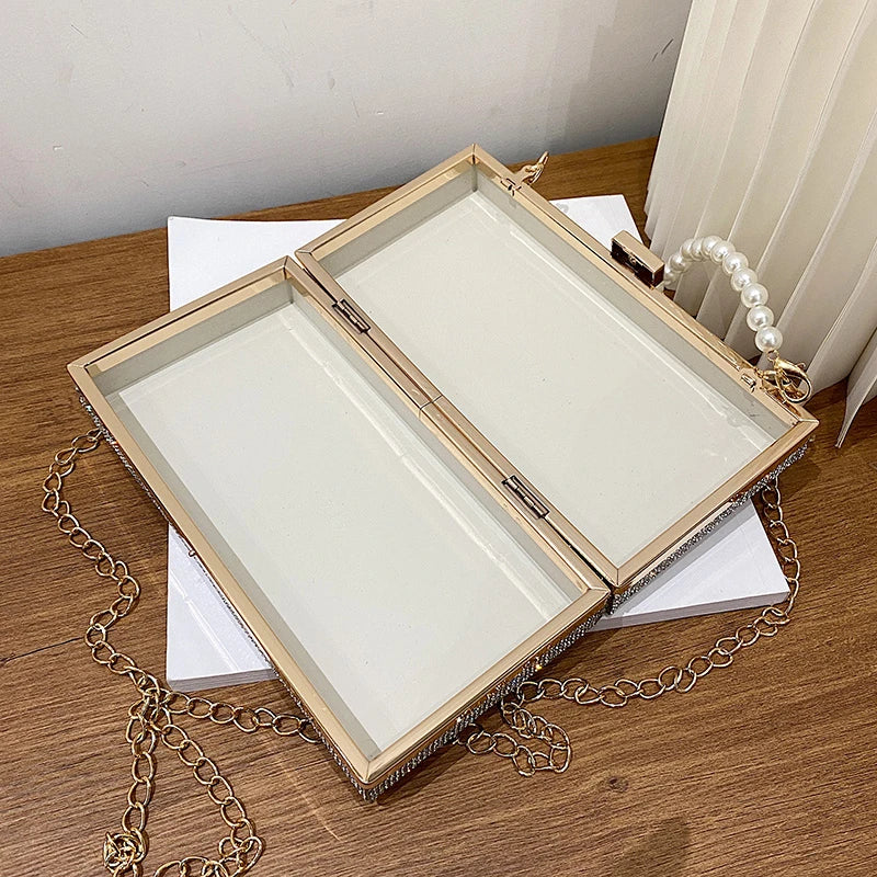 This party metal box clutch purse features a classic design with dazzling diamonds. Perfect for any special occasion or night out.