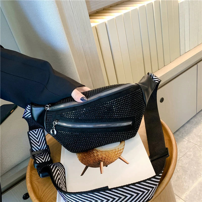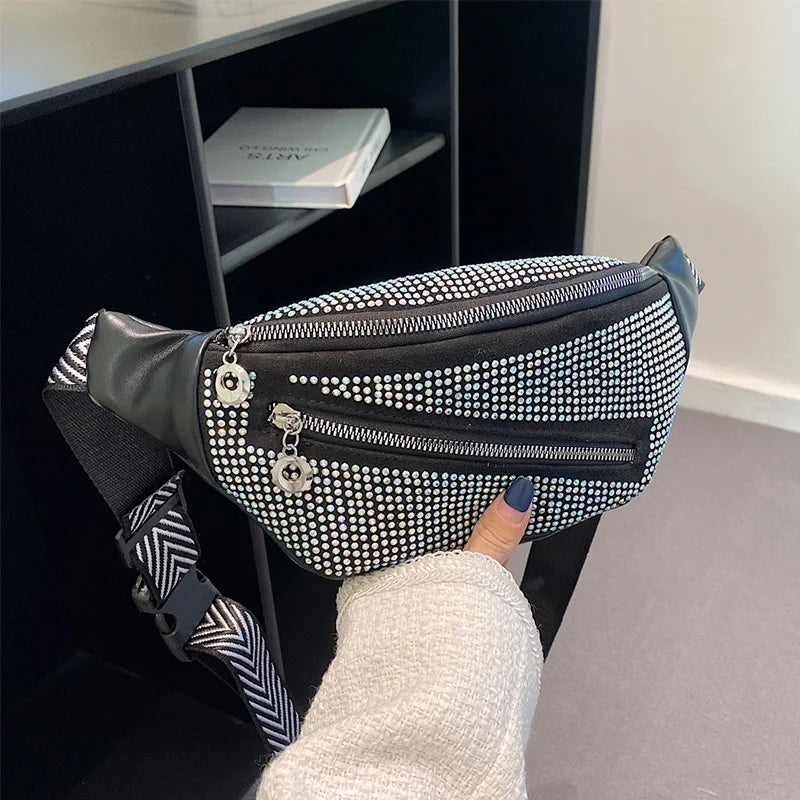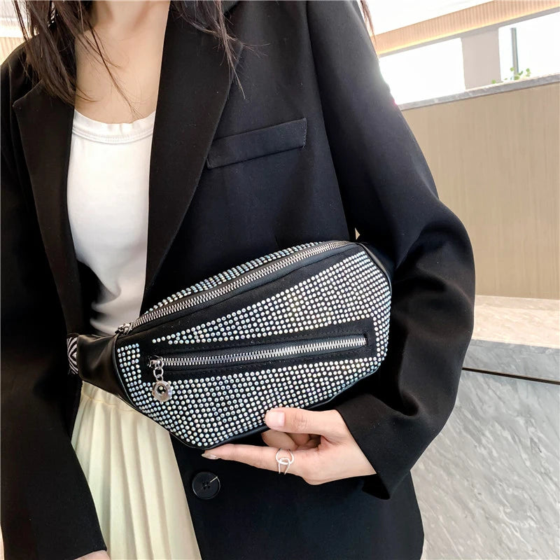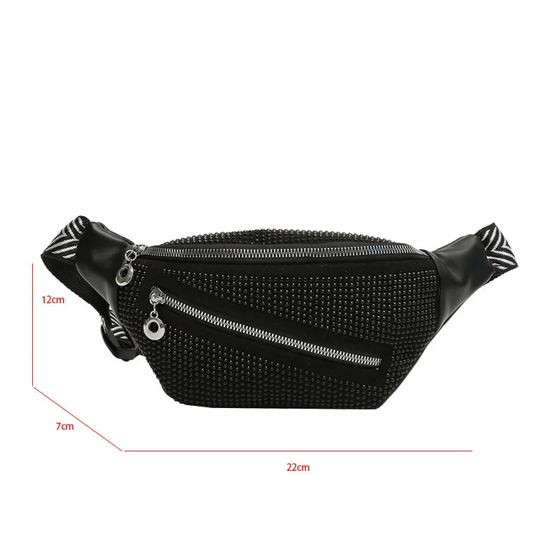 This stylish fanny pack is adorned with diamond studs, making it a fashionable accessory for women. It can be worn as a chest bag, waist bag, or crossbody bag, and is perfect for carrying your phone and essentials.