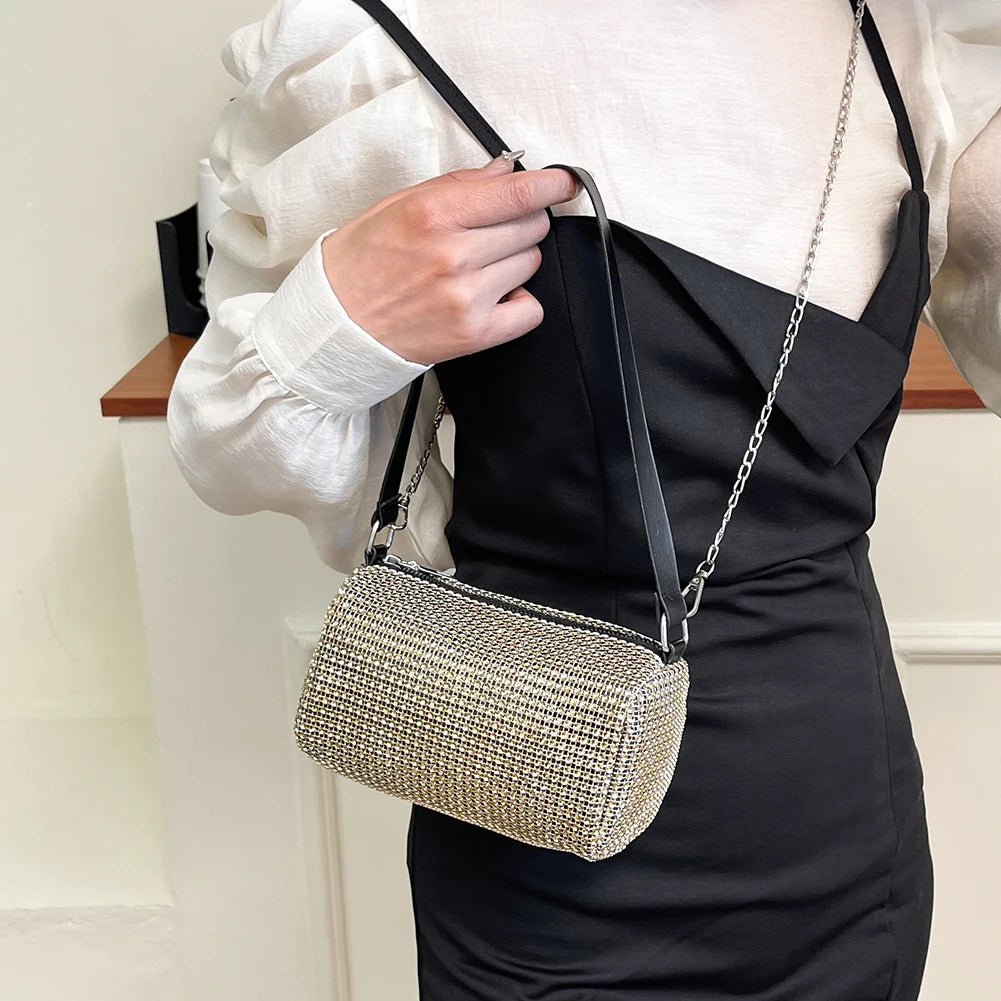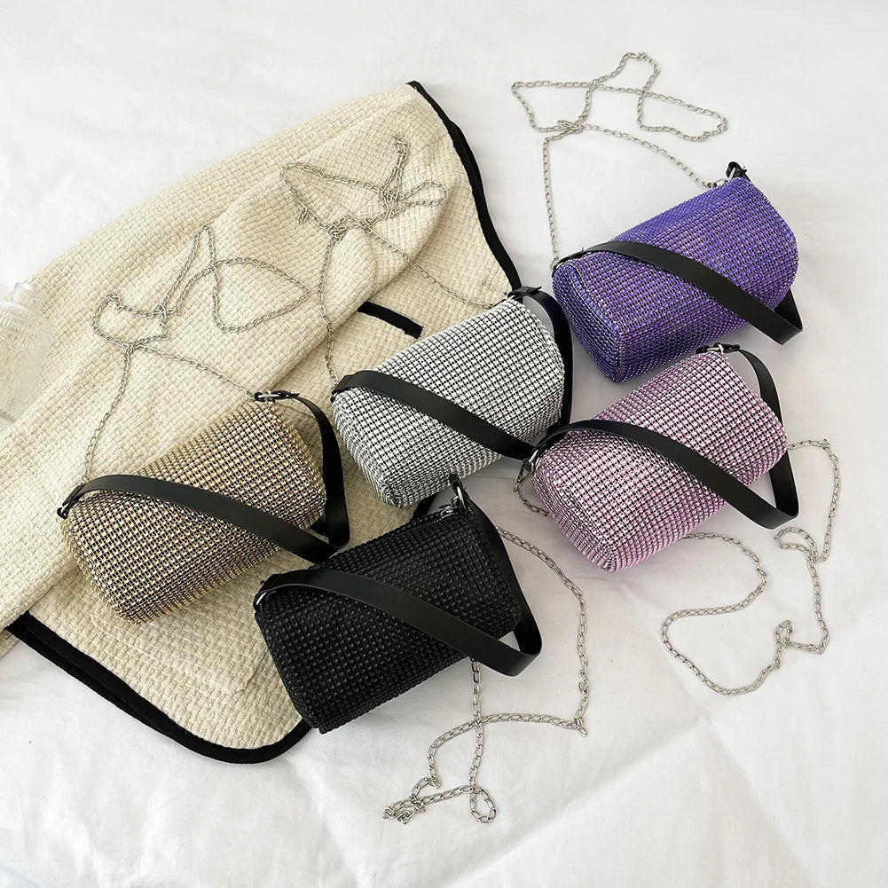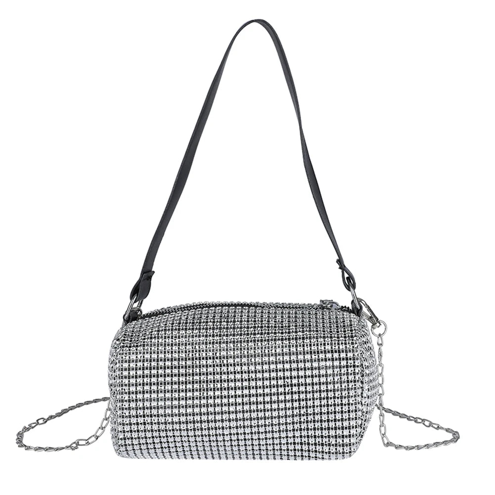 This Bright Diamonds Tote Bag is a stylish and convenient accessory for women. It features a portable design with a chain strap, zipper closure, and spacious bucket shape. Perfect for everyday use or special occasions.