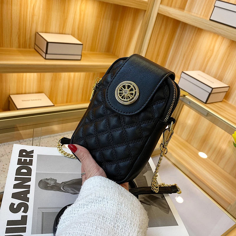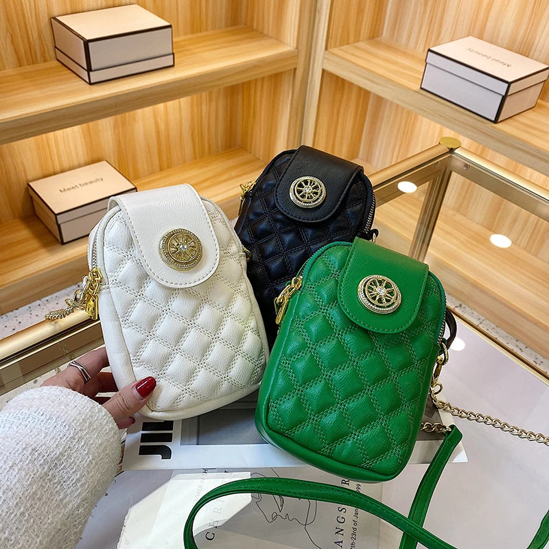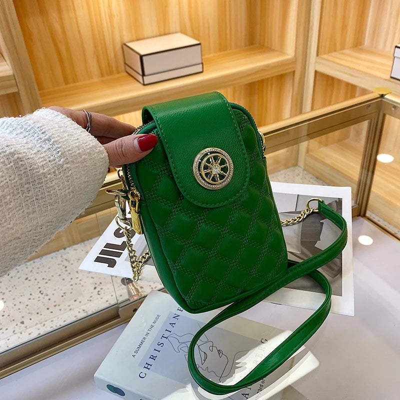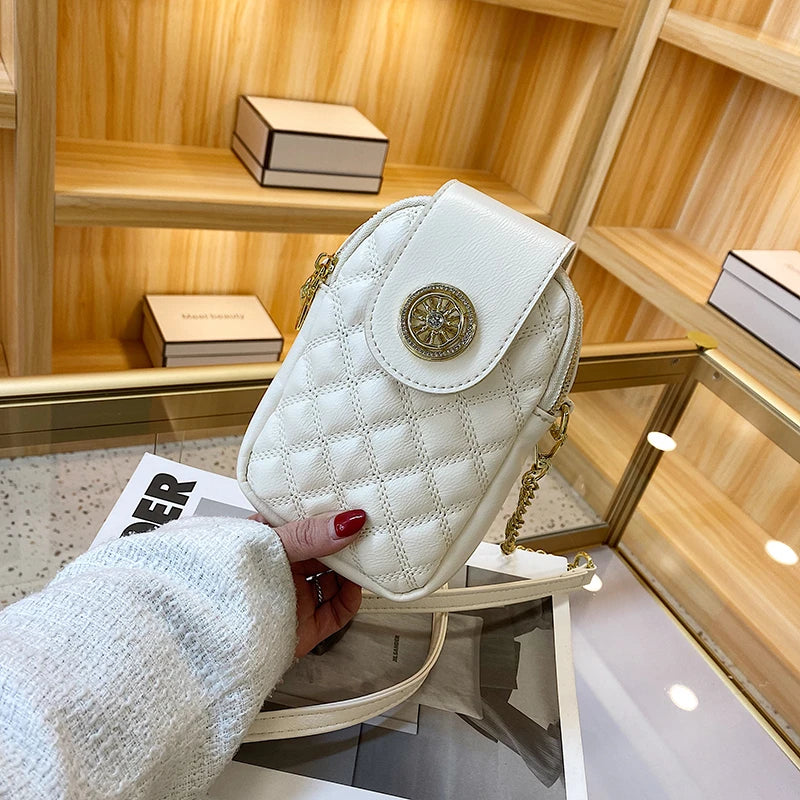 This stylish mobile phone bag features a diamond design, perfect for women on the go. It can be used as a messenger or crossbody bag.