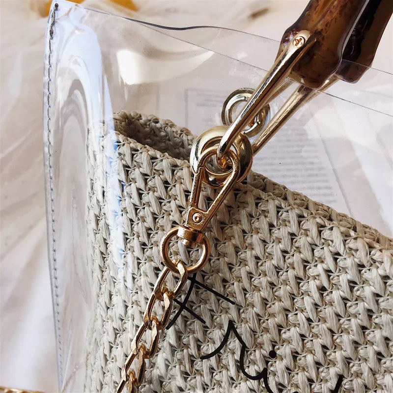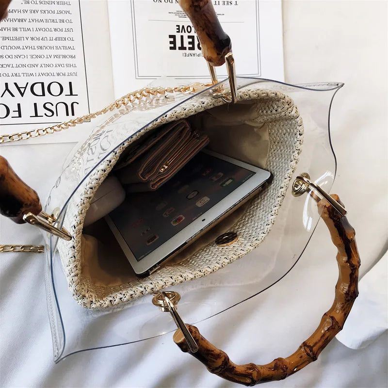 Elevate your style with this transparent bag that's perfect for women. It features a clear jelly design, making it a modern and trendy choice. The bamboo weave detailing adds a unique touch to this shoulder bag.
