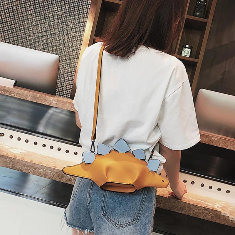 Adorable cartoon dinosaur shaped shoulder bag made of PU leather, perfect for women. Features a coin purse and creative design.