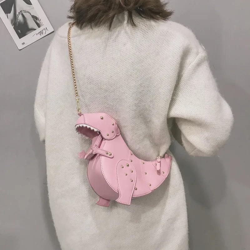 This stylish crossbody bag features dinosaur rivets, perfect for women who love a unique touch. It includes a shoulder chain for easy carrying.