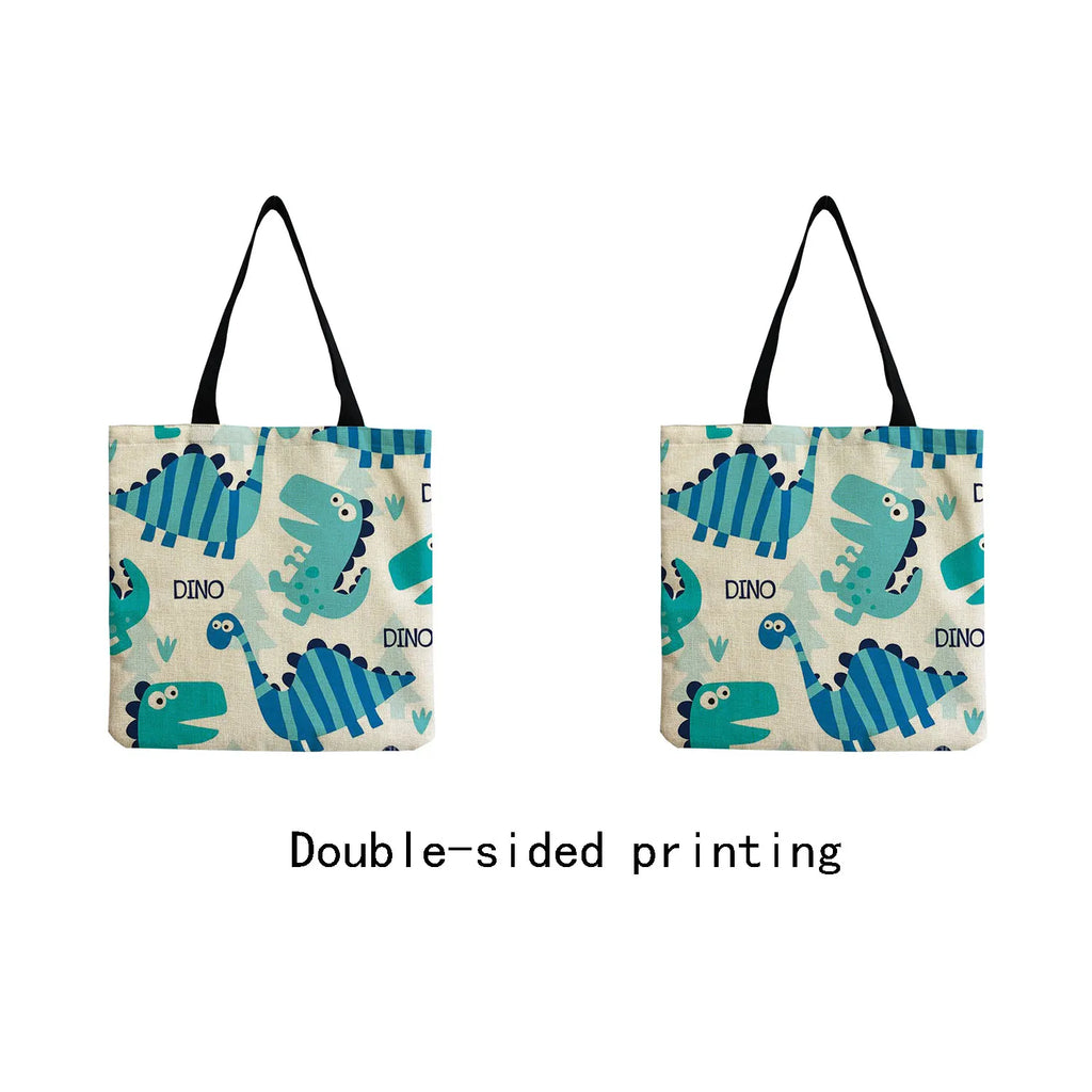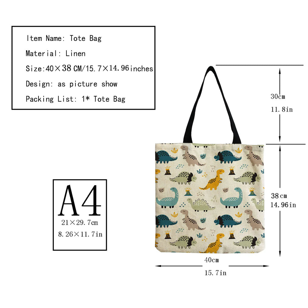 This eco-friendly tote bag features a cartoon dinosaur print. It is perfect for travel and outdoor activities, with a high capacity for all your essentials. Customizable design for a unique touch.