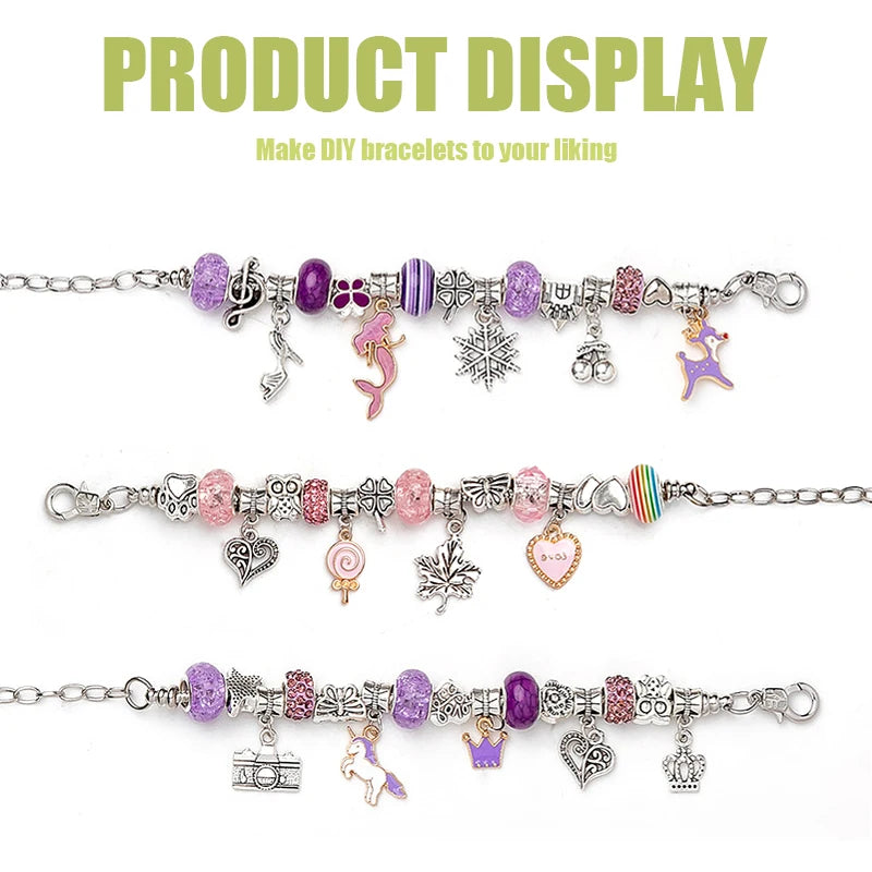 Create your own charm bracelets with this complete set that includes glass beads, spacer beads, pendant accessories, and a jewelry storage box. Ideal for jewelry making.