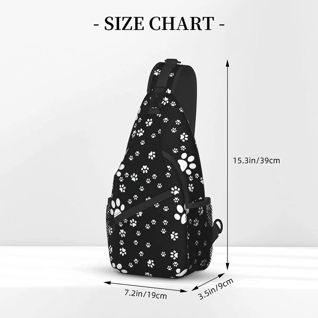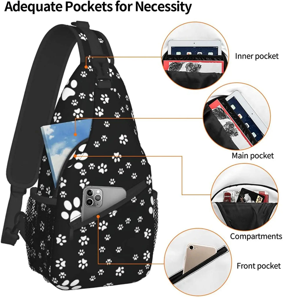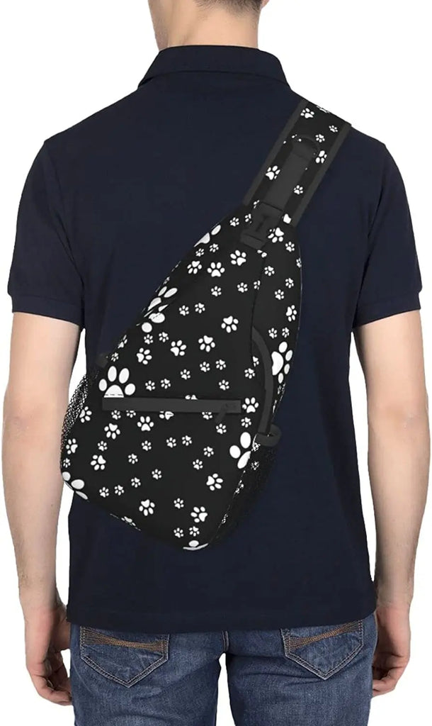 Description:This sling backpack features a dog paw prints and bones design, perfect for men and women on the go. Ideal for sport and hiking activities.Features: Sling backpack with unique dog paw prints and bones design Ideal for men and women, perfect for sport and hiking outings Adjustable shoulder strap for...