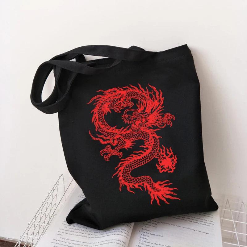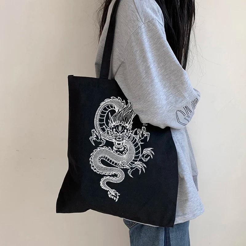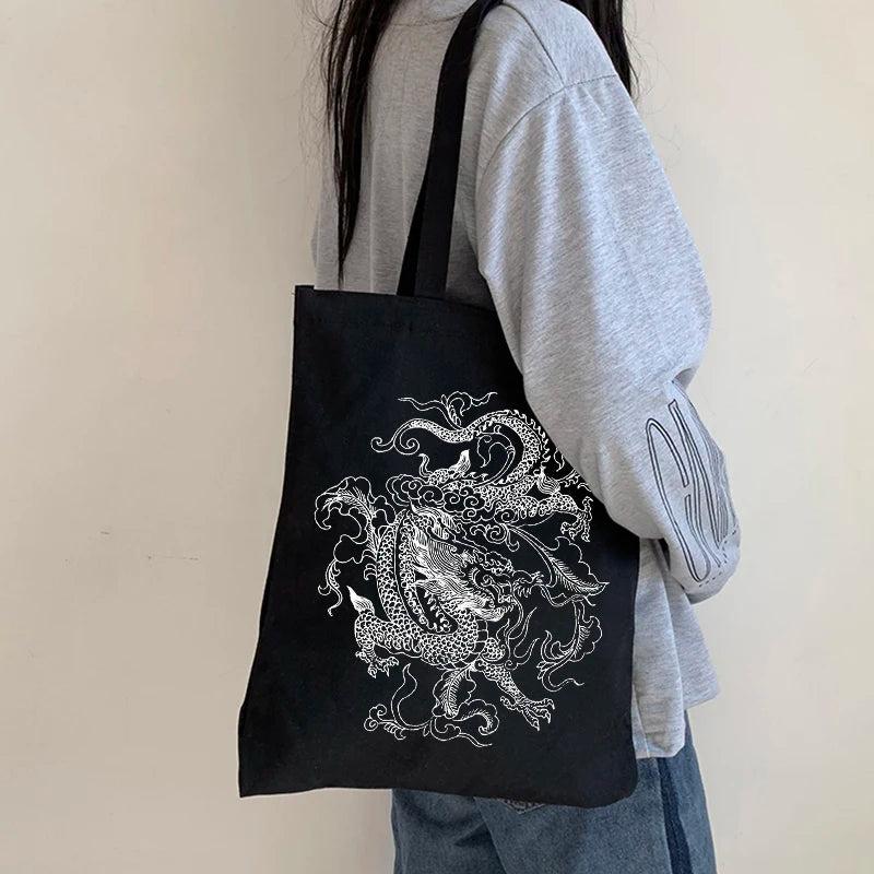 This canvas shopper bag features a cool dragon print design, perfect for those into Harajuku, Y2k, punk, or gothic styles. It can be worn as a shoulder bag and is a stylish accessory for any outfit.